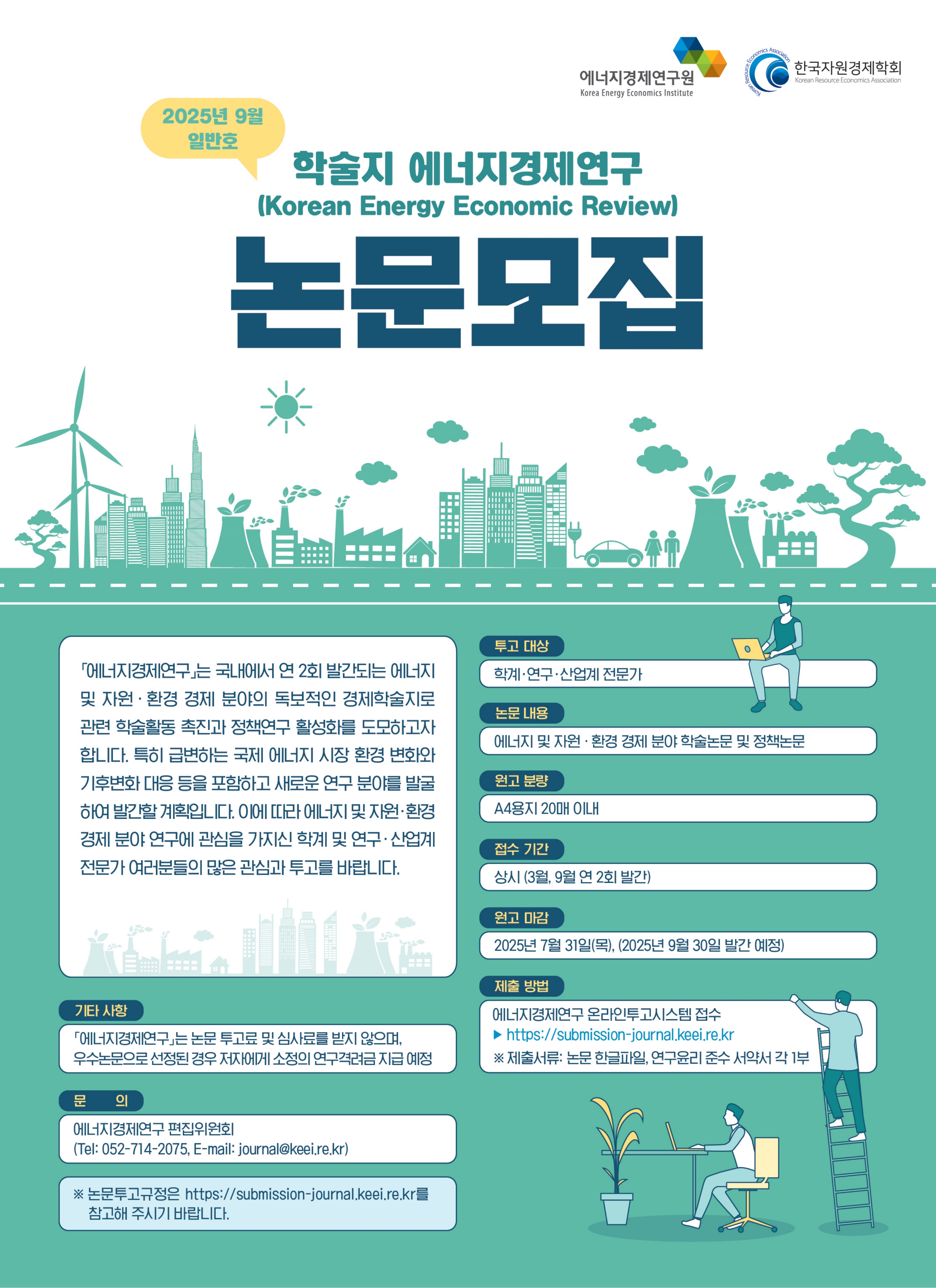 「에너지경제연구」를 내년 2회(3월·9월) 발간하고 있으니, 에너지 및 자원·환경 경제 분야 연구에 관심을 가지신 학계 및 연구·산업계 전문가 여러분들의 많은 관심과 투고를 바랍니다.
